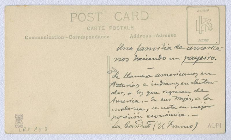 Una familia de americanos haciendo un paqueiro. Le llaman americanos en Asturias a indianos en Santander, a los que regresan de América. En sus trajes, a la moderna, se nota su mejor posición económica.- La Caridad (El Franco)